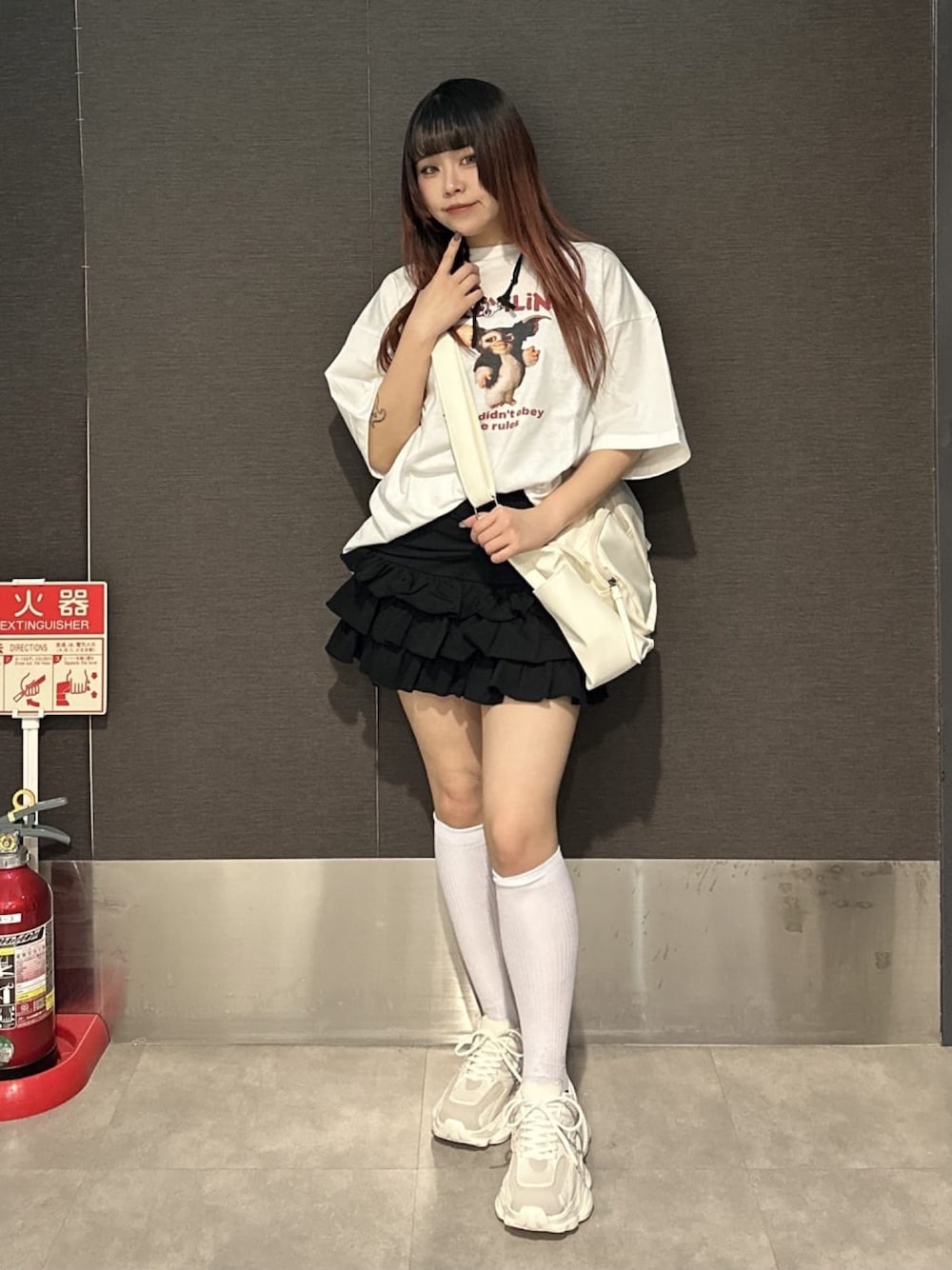 キャラTを使ったガーリーコーデです❣️ グレムリンが大きくプリントされていて可愛いです!Lサイズを着用して居るので大きめで着たい女の子にもおすすめです🌟🌟 デザインのバリエーションも豊富なのでおそろコーデにぴったりです♪