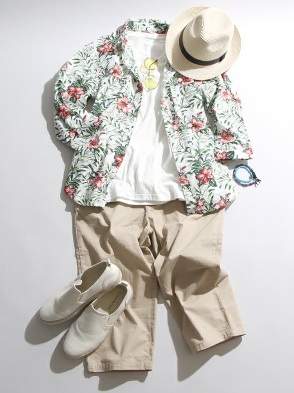 花柄のリネンシャツを主役にしたサマーコーディネート。 アクの強いアイテムは、極力シンプルなアイテムと組み合わせることで、いやらしく見えず、こなれた雰囲気を演出できます◎