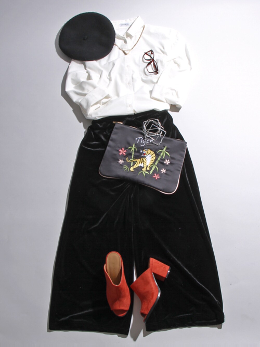 09.12 光沢のあるベロア素材のワイドパンツを主役とした、秋のモノトーンコーディネート。 足元にオレンジ色のサンダルを取り入れることで、色が映え着こなしのアクセントに◎ BIGシャツは程よいワイドサイズなので、一枚で着用頂くのは勿論、 今の時期はライトアウターとしてさらっと羽織って頂くのもオススメです!! 是非、この機会にチェックしてみて下さい♪