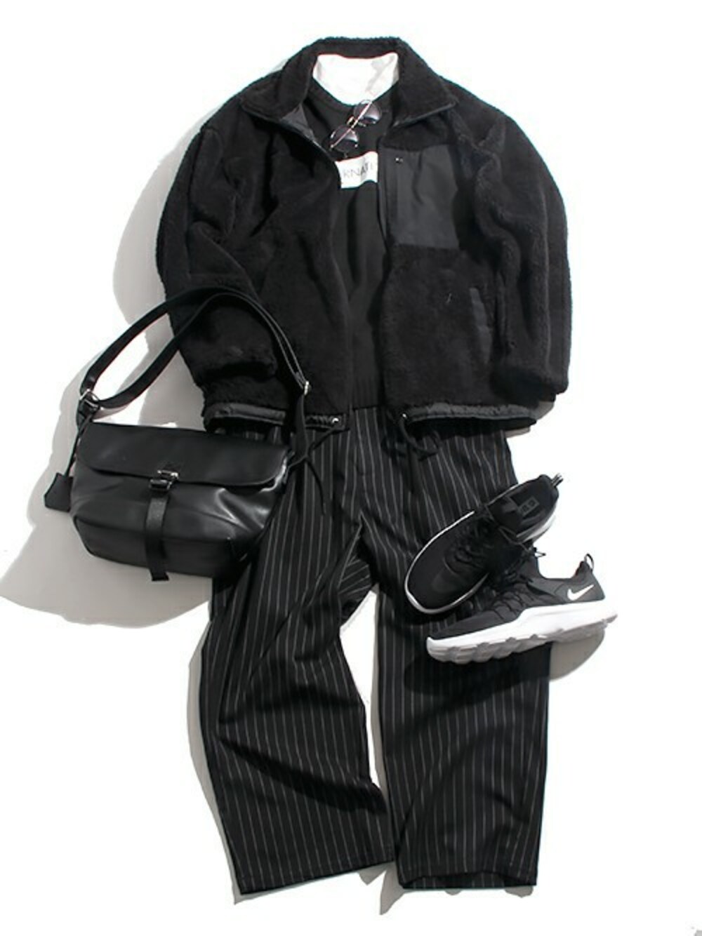オールブラックでまとめて、白を差し色に使用したカジュアルモードなスタイリング。 全体的に動きやすく楽な着こなしですが、黒の統一感で野暮ったくならず、スマートに見せることが出来ます。 このアウターは暖かいのにとにかく軽く、ウールコートの重さや堅さが苦手な方には特にオススメです。 リバーシブル仕様ですので、一枚でもまた違う雰囲気が楽しめます。 インナーのモックネックで手軽に今年らしいレイヤードスタイル◎
