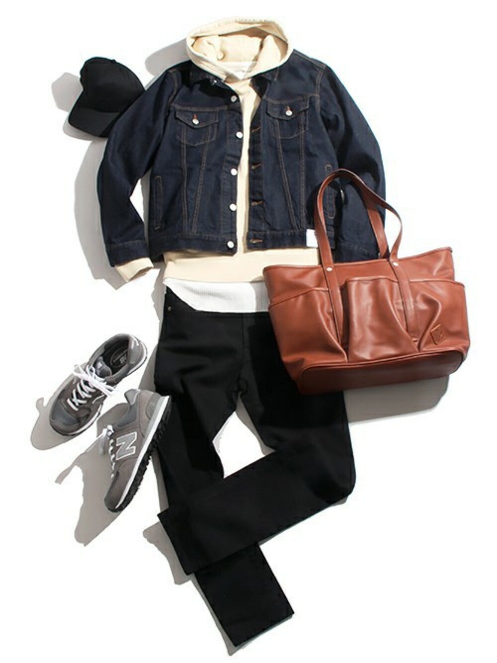 デニムジャケットを使用した王道の鉄板スタイル。 軽さのあるオフホワイトカラーのパーカーで春らしさを上乗せ。 同系色のキャメルトートで重たくなり過ぎないように。 見せインナーとのレイヤードで、程よくラフにしながらもスキニーでスッキリシンプルに。 全体を通して清潔感を意識した爽やかな着こなしは、万人問わず好印象でオススメです◎