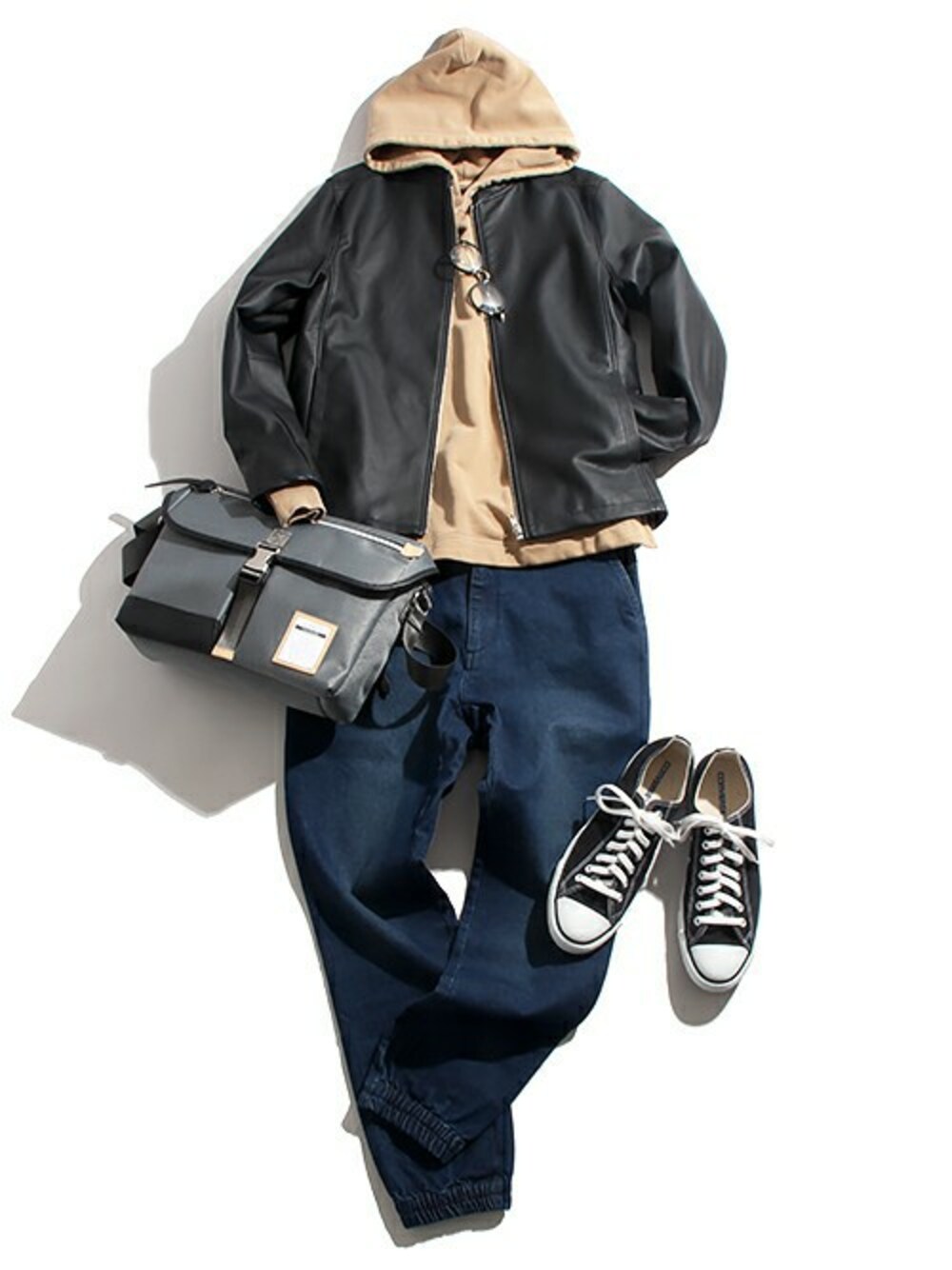 シングルライダースを使用したアーバンスタル。 着まわしやすいシングルライダースにジョガーデニムとパーカーで今年らしく、ラフに落とし込んだシンプルな着こなし。 ネイビーとベージュは相性がよく、色味も強いのでライダースのハードな印象を和らげてカジュアルに。 どのアイテムもベーシックなので使い勝手良く重宝するものばかり。 きれい目のカバンや眼鏡と合わせてシックにまとめたら完成です。