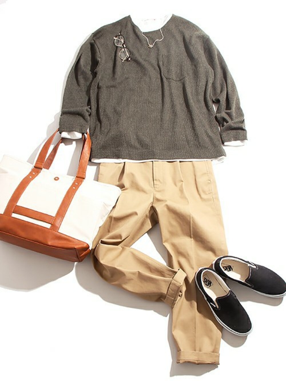 シンプルながらも清潔感ある着こなし。 程よくラフなサイジングに注意しながら、アースカラーを中心に落ち着きあるカラーリングでまとめています。 足元は黒でしめて。今の時期ならアウタープラスして、春先には足元をロールアップしても季節感が増して、よりGOOD◎