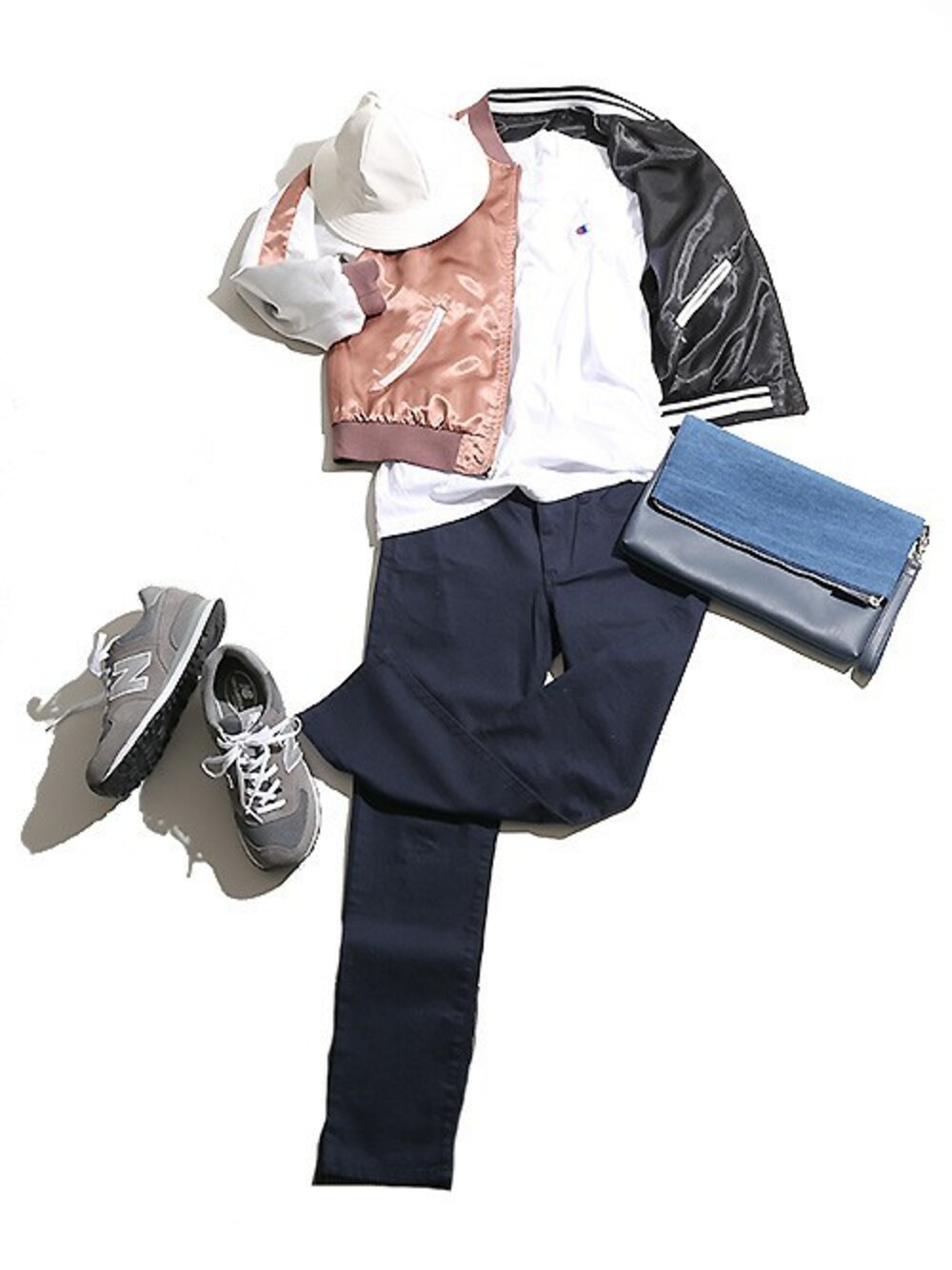 今季も大人気のスカジャンをベースにホワイト、ブルー、グレーでまとめた春らしいスタイリング。 スカジャンの裏面は単色仕様のラインリブになっており、そちらをベースにしたモノトーンコーディネートにしても使い勝手が良いのでオススメ。 ハットは今季トレンドのメトロハットを採用。単色仕様ながらベーシックなデザインでスタイルを選ばず、様々なシーンでお使い頂けます。 着回し抜群な春の多機能ストリートコーデとなっております◎