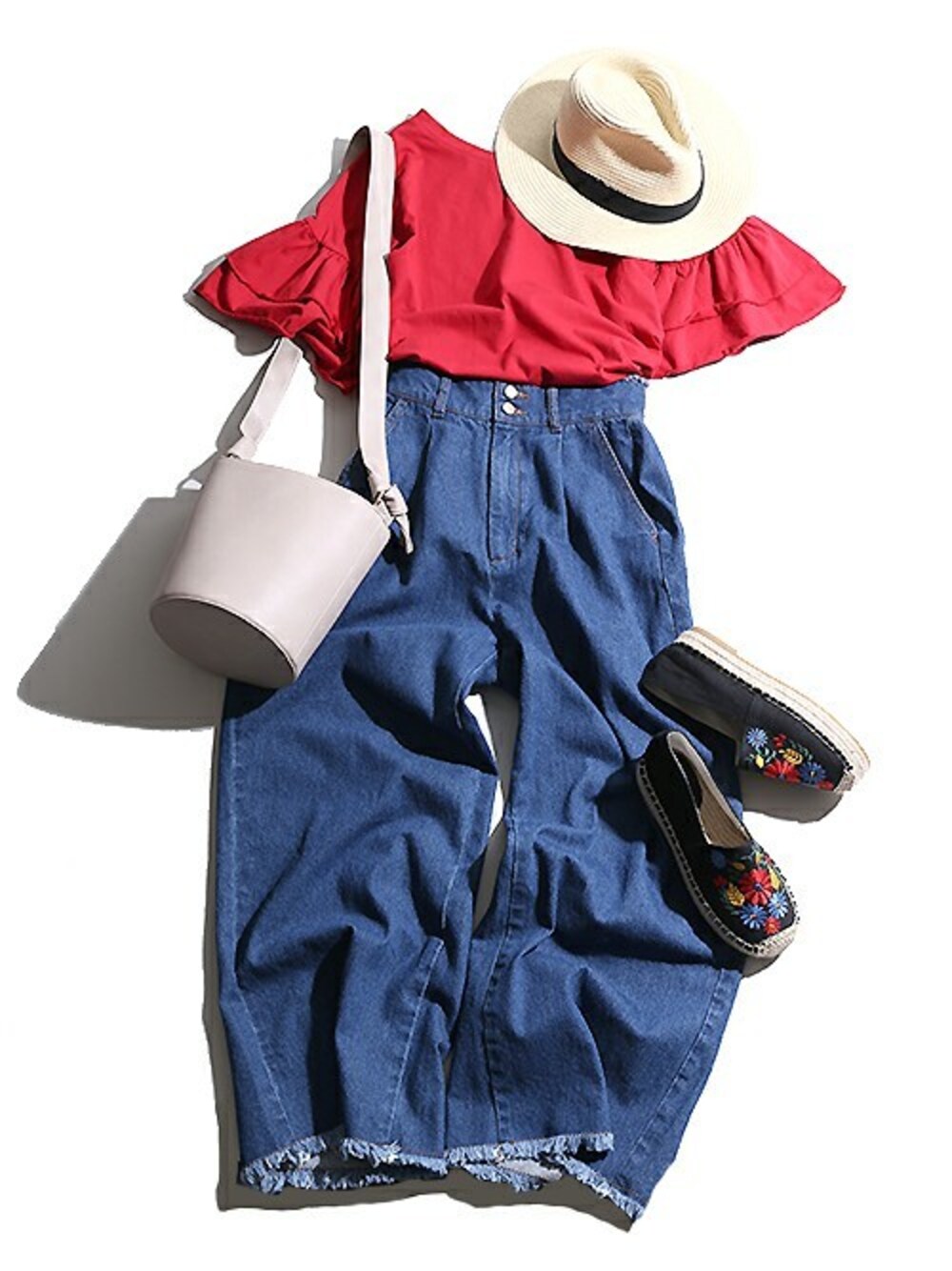 今回は【ハイウエストフリンジバギーパンツ】を使った初夏コーデをご紹介! ウエストや裾口に施したフリンジデザインが、手軽に着こなしのアクセントに◎ プラス、バギーパンツは足長効果も期待できる嬉しいアイテム♪ トップスの【ティアードラッフルスリーブカットソー】は、 袖のボリューム感が肩回りを華奢に見せてくれ、女性らしさUPにも☆ 足元には夏のマストアイテム、エスパドリーユ。 ハットはペーパー素材にチェンジして季節感を◎ 是非、この機会にチェックしてみて下さい!