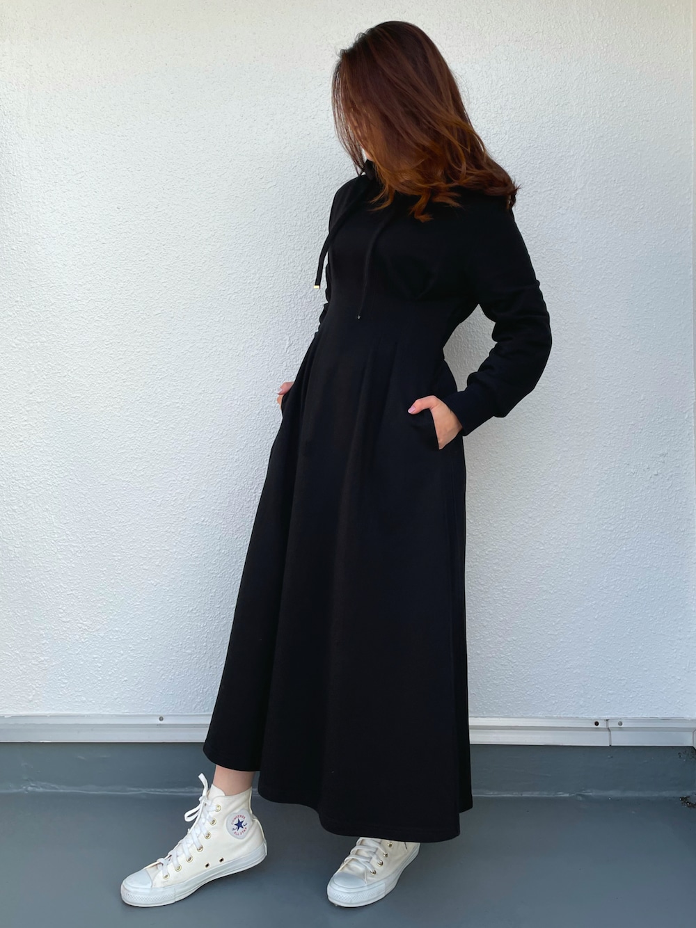 ☀️休日コーデ✨ お家でもお出掛けにも楽々使えるパーカーワンピー、ふくらはぎまで隠れるミモレ丈で清楚な雰囲気を醸します。 ハンカチやちょっとした小物をを持ち運べるポケット付きで機能性もバッチリ。 袖口は太めのリブで切り替えられたカジュアルなデザイン。 ご覧いただきありがとうございました😊いいね、フォローお願いします🤲