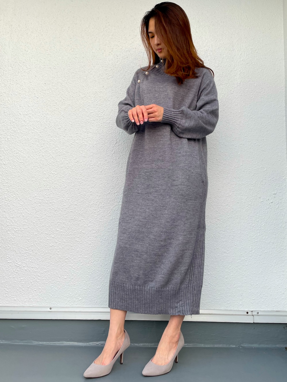 ☀️おはようございます♪ 本日はワンピースコーデ👗 🥰体型カバーとスタイルアップが同時に叶うコクーンシルエットのハイネックニットワンピース。 🥳首元は斜めボタンデザインで、いろんな着こなし方を楽しめるリブ切替のハイネック。 ご覧いただきありがとうございました。いいね、お気に入り、フォローお願いします🤲。