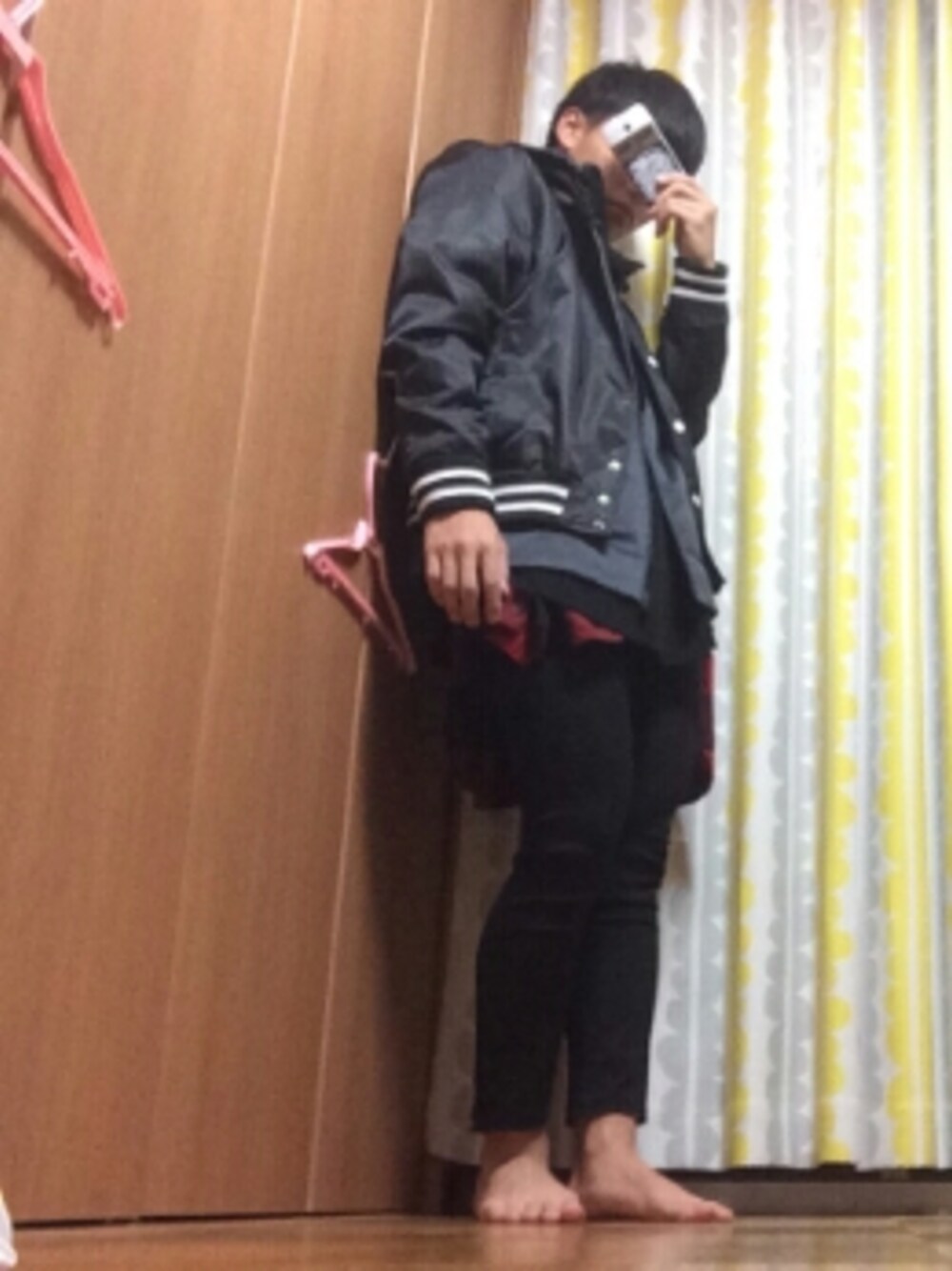 全身黒を主にしたコーディネートです そこにか赤と黒のチェックカッターを腰に巻きました!!