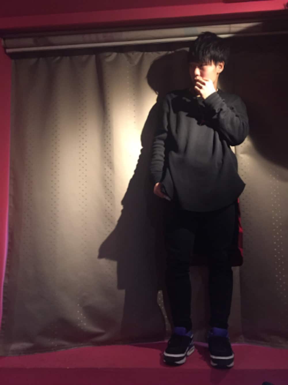 全身黒を主にしたコーディネートです! 黒に赤色のネックレスとカッターシャツをこしに巻き 強調しました! 全体的にシンプルです あとこれカラオケの中なのでバリ薄着です爆笑