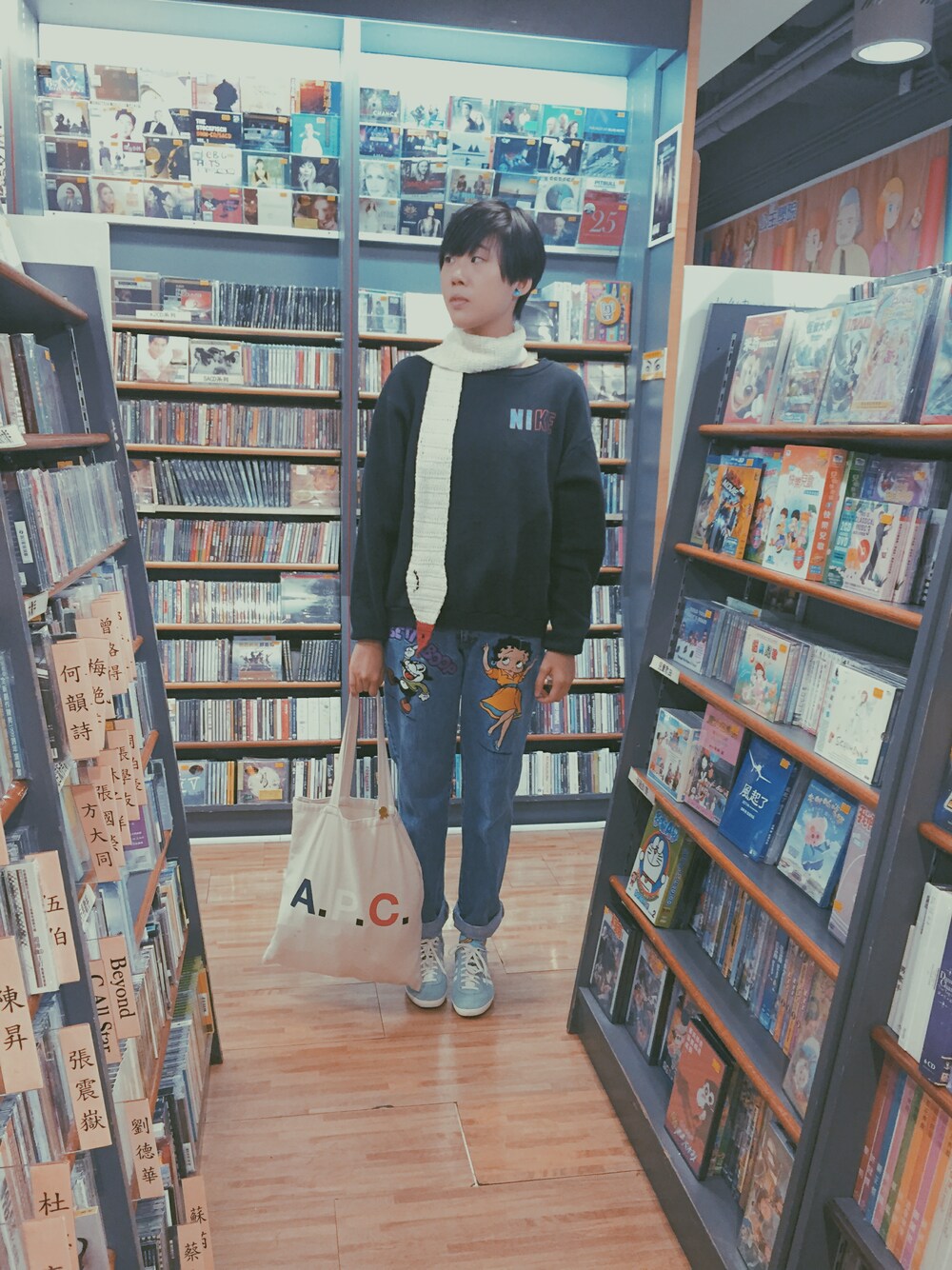 top:Nike vintage scarf:vintage bottom:vintage shoes:adidas tote bag:A.P.C