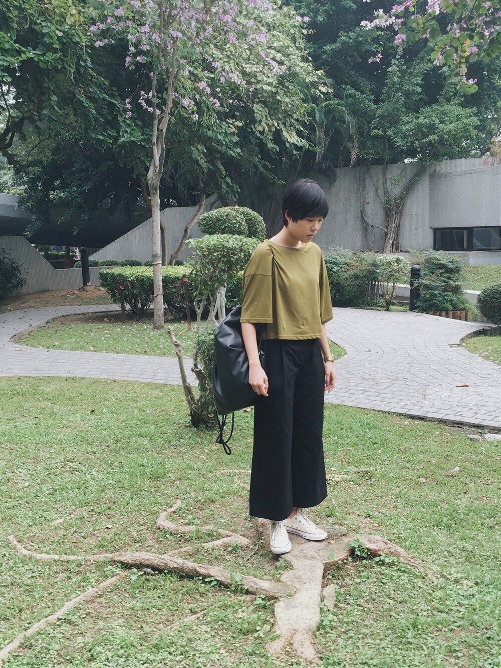 ブラック系のその他パンツを着用したレディースの春コーディネートの1枚目の写真