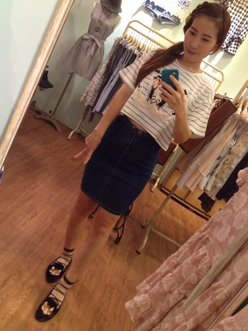 橫條短T:boho chic 牛仔窄裙:boho chic 短襪:品牌不詳 鞋:品牌不詳