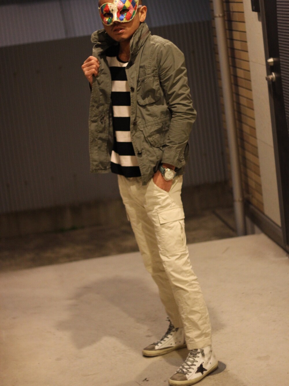 UNIQLOミリタリーコーデ。スニーカーはゴールデングース。