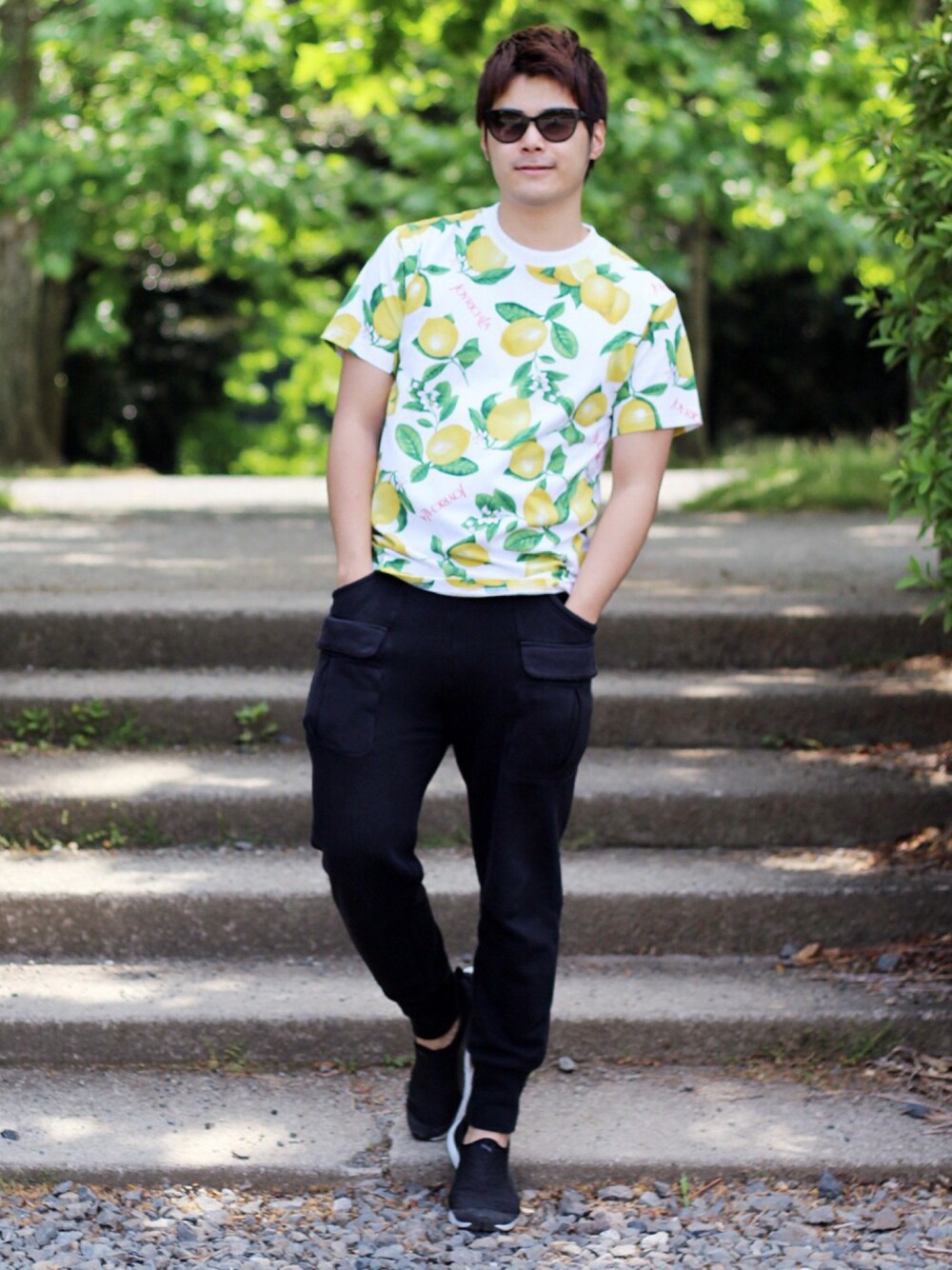 女子が着ているレモン柄が可愛すぎて メンズにもないかな〜?と思っていたら、 たまたま通りかかったお店でTシャツ発見!