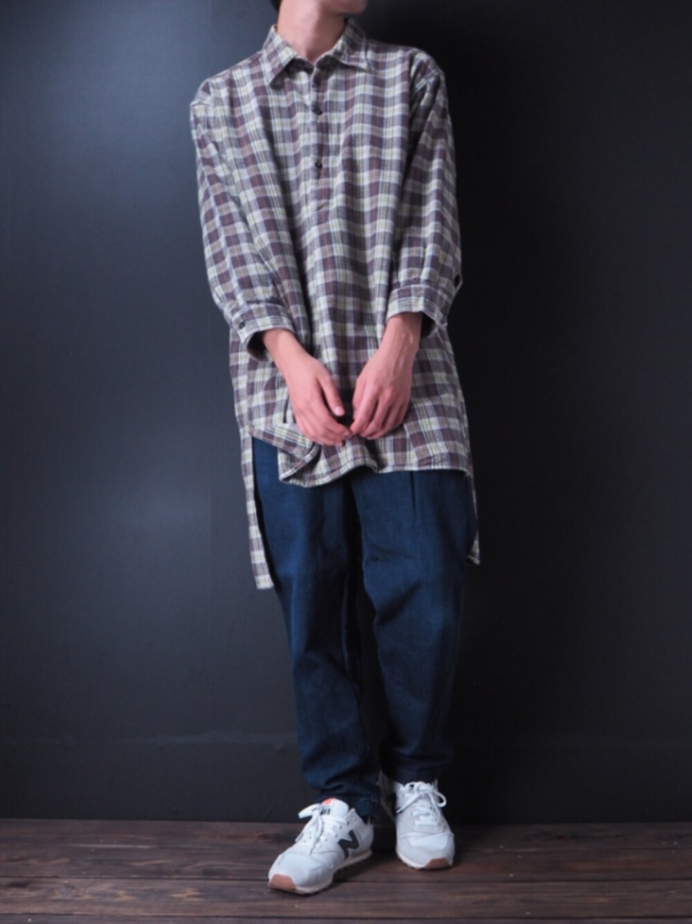 ご覧いただきありがとうございます。 今日はグランパシャツとワイドデニムパンツののコーデです。