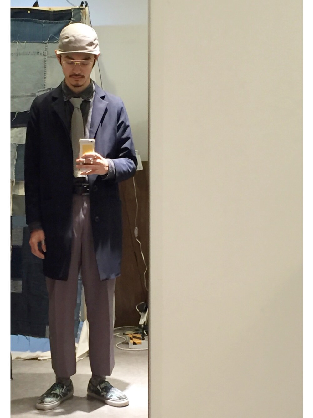 ブラック系のダウンジャケット/コート、グレー系のスラックス、その他のスニーカーを着用したメンズの冬コーディネートの1枚目の写真