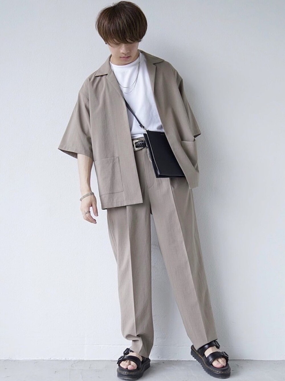 MONKEY TIMEで購入した セットアップコーデ✨ このセットアップかなり生地感が 薄くて軽いからインナーにTシャツ 入れても暑くない🙆🏻♂️ かなりドレープ感もあって自然と 小慣れた演出もできて◎ 着るだけでお洒落に見えるってこと です!! 夏のセットアップお探しの方は是非 オススメ✨