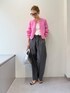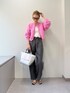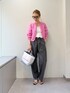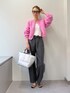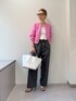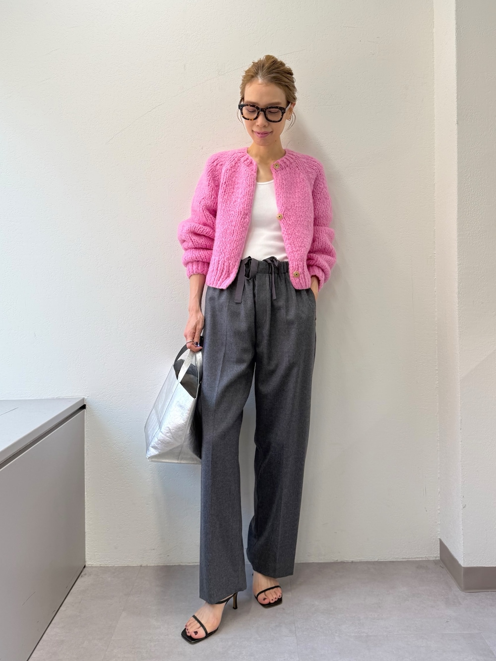 【カーディガン】普段サイズ7号/着用サイズF 暖かい時期はタンクトップをインナーにしてヘルシーに、寒くなったらタートルを忍ばせて◎着こなしも楽しめるハンドニットカーディガン。鮮やかなピンクが可愛いです。派手になりすぎないように私はグレーのパンツをスタイリング。ワンポイントカラーがあるので、中間色のグレーで中和しました。今年こそピンクを着てみたい方にもおすすめのコーディネートです。 【パンツ】普段サイズ7号/着用サイズF ウエストリボンによってサイズ調節が可能なワイドパンツ。ウエストゴム仕様ですが、細身の私にはややサイズが大きめなのでしっかり紐で締めると良い◎。シルエットも崩れず綺麗に穿けます。お好きなウエスト位置で穿いて頂けます。スーツやジャケットによく使われるサキソニーウール素材です。見た目にも季節を感じられる生地です。 【バッグ】サイズ F ペーパー素材のトートバッグ。物足りないスタイリングに一味プラスしてくれます。
