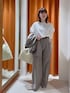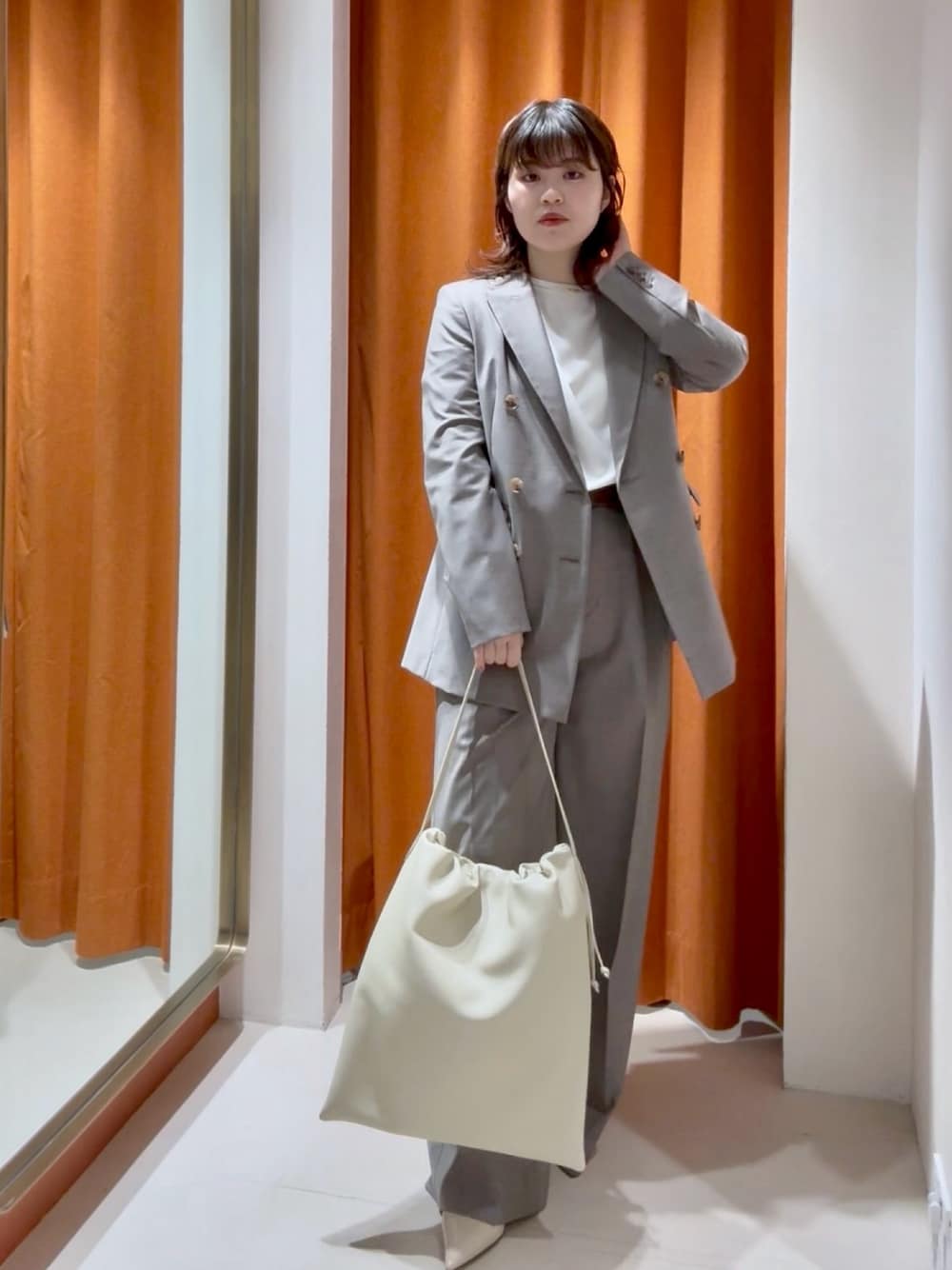 【Vガゼットプルオーバー】F Whim Gazetteの名品アイテム。 程よい生地の薄さで着心地も良く、長い季節お召し頂けます。Tシャツ感覚で着れますがハリ感があるためカジュアルになりすぎず大人コーデにぴったりな1着です。 【ジャケット】モカ/38 トレンドレスでシーンを選ばすにお召し頂けるダブルジャケット。光沢感のある素材が上品でコーディネートをワンランク上に引き上げてくれます。 【センタープレスワイドパンツ】モカ/38 Drawing Numbersの名品パンツ。つやっとした生地で落ち感があり、美シルエットです。カジュアルにも綺麗めにも合わせやすく、コーディネートの幅が広がります。 【エナメルパンプス】ベージュ/38 コーディネートにツヤ感をプラスできるアイテム。ストラップがあるので歩きやすかったです。23.5〜24サイズの私は37サイズが履きやすかったです。 【Hoaw.ショルダーバッグ】アイボリー 柔らかなレザー素材のショルダーバッグ。A4サイズ対応です◎高級感のあるシュリンク加工によるシボ感が魅力的で、傷などが目立ちにくくお仕事〜プライベートまで様々なシーンで活躍してくれます。 【knotチョーカー】ゴールド 華奢なシルエットでさりげなくツヤ感をプラスできるアクセサリー。フックのデザインなので動いても落ちる心配なくお召し頂けます。他のアクセサリーとの重ね付けもおすすめです。