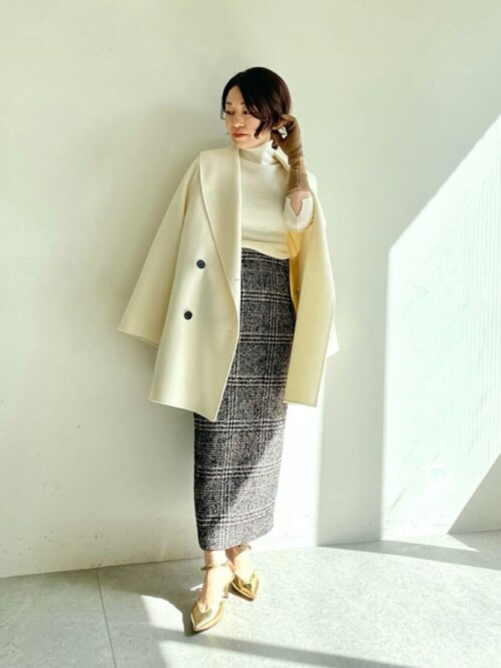 女性らしいさにスタイリッシュさを加えたコーディネートです。 【コート】 白いリバーコートは着映えるアイテムです。軽くてサッと羽織れ、サマになるアウター。厚手のニットも着ることができます。程よい丈感でコーディネートを楽しめます。 【スカート】 ハイウエストでスタイルが良く見えるサロペスカート。女性らしさがあり、ツイードが季節感を出してくれます。ロングブーツ合わせもおすすめです。WEB限定です!
