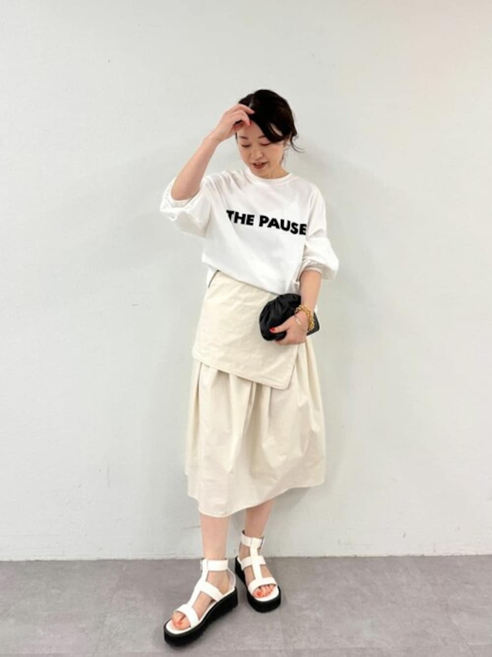 大人の2wayワンピース。 今回はスカートとして着用。 程よいハリとしっとりとした質感で着心地良し。ワンピースとして着るときは、クシュクシュっとウエスト部分に生地を寄せて着るのでデザイン性があります。サイドのファスナーを下ろすとスカートとしても着ることができますよ。こちらも素敵。今日はロンTと合わせました。 リゾートにもおすすめのワンピースです。