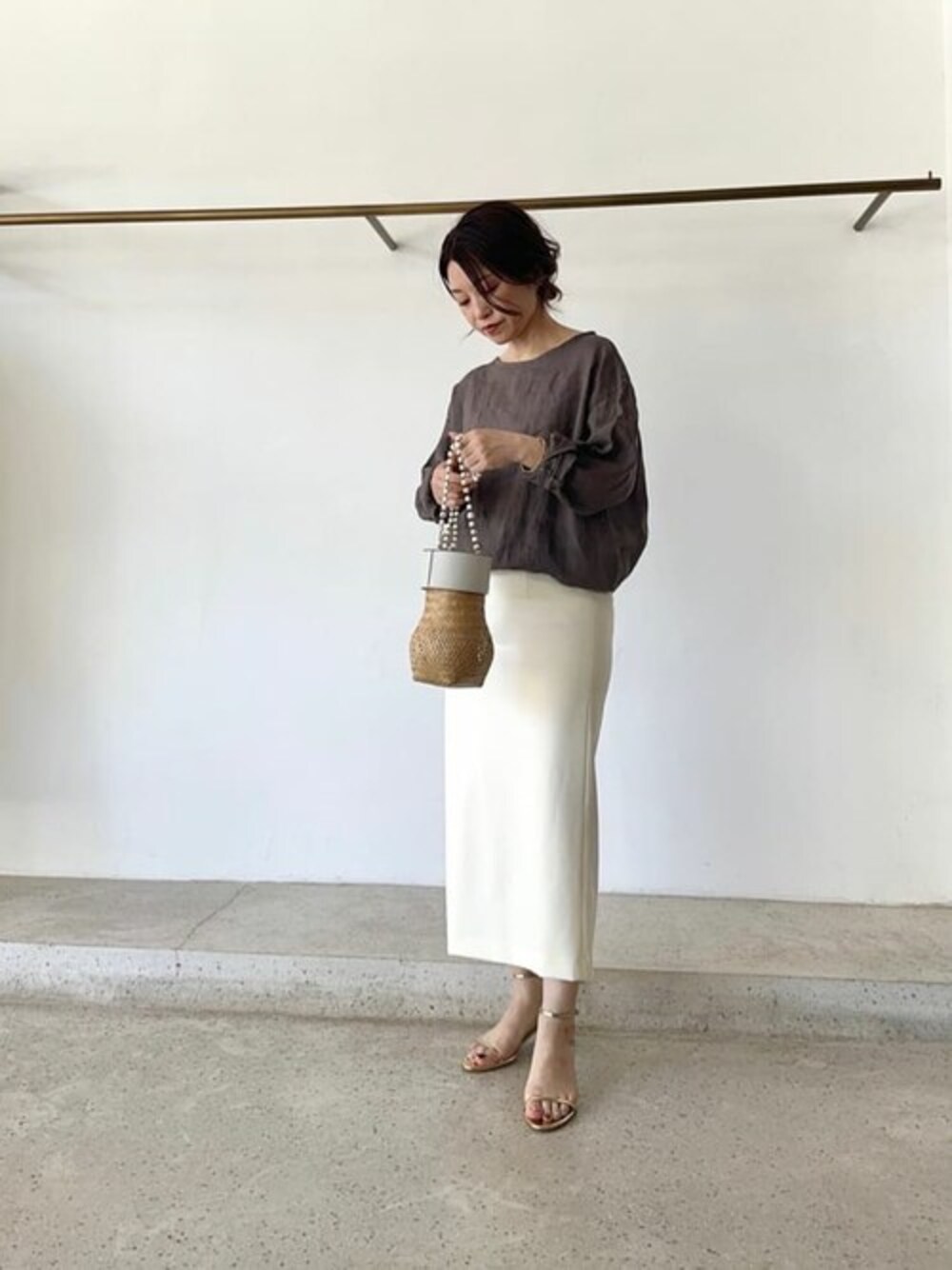 安定のラミーブラウス。ボトムはしっとりとした質感のタイトスカートです。 【ブラウス】 こなれ感がでるラミー素材。コットンとは違った涼しげな印象に。詰まり気味のネックに見えますが、割と横に開いたデザインなので、上半身がスッキリと見えます。今季はカラー展開が豊富。 【タイトスカート】普段38サイズ/38サイズ着用 しっとりとした履き心地で、素材の良さを感じるタイトスカート。後ろにスリットが入っておりますので、足捌きよくお使いいただけます。程よい伸縮性がありますので、ストレスなく着用できます。きれいめなのでオフィスにも是非。
