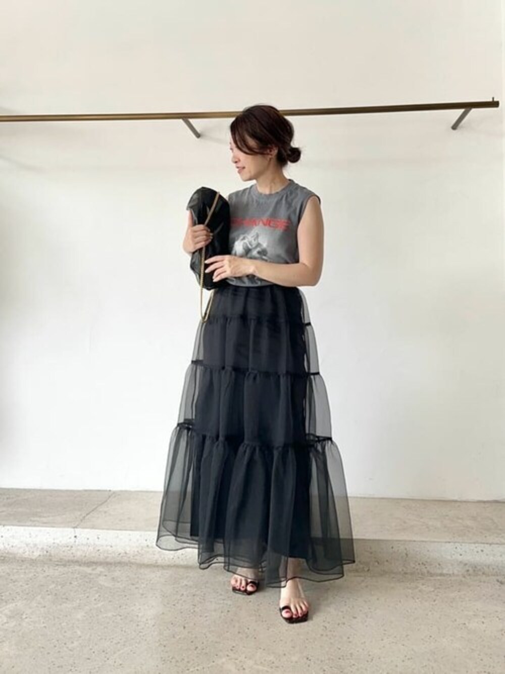 カジュアル+きれいめのMIXコーデ。 【カットソー】 デザインが目をひくカットソー。さり気なくコーディネートのポイントなります。主張しすぎず、自然とこなれ感がでるオシャレアイテム。一枚持っておくと、メリハリがでます。着心地も良いですよ。 【オーガンジースカート】普段38サイズ/フリーサイズ着用 魅力的なオーガンジースカート。フワッとした素材感が一気に華やかな雰囲気にしてくれます。インナーのサイドスリットが潔く、抜け感を出してくれます。ブーツ合わせも素敵だと思います。上品な大人の女性に履いていただきたいアイテムです。