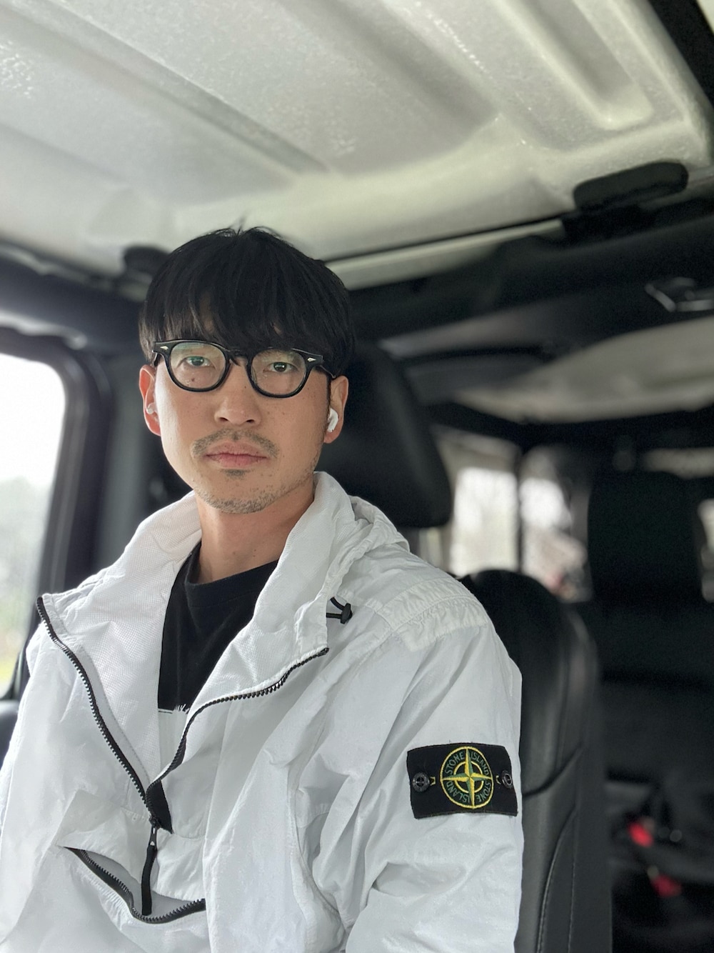 ホワイト系のマウンテンパーカーを着用したメンズの春コーディネートの1枚目の写真