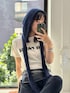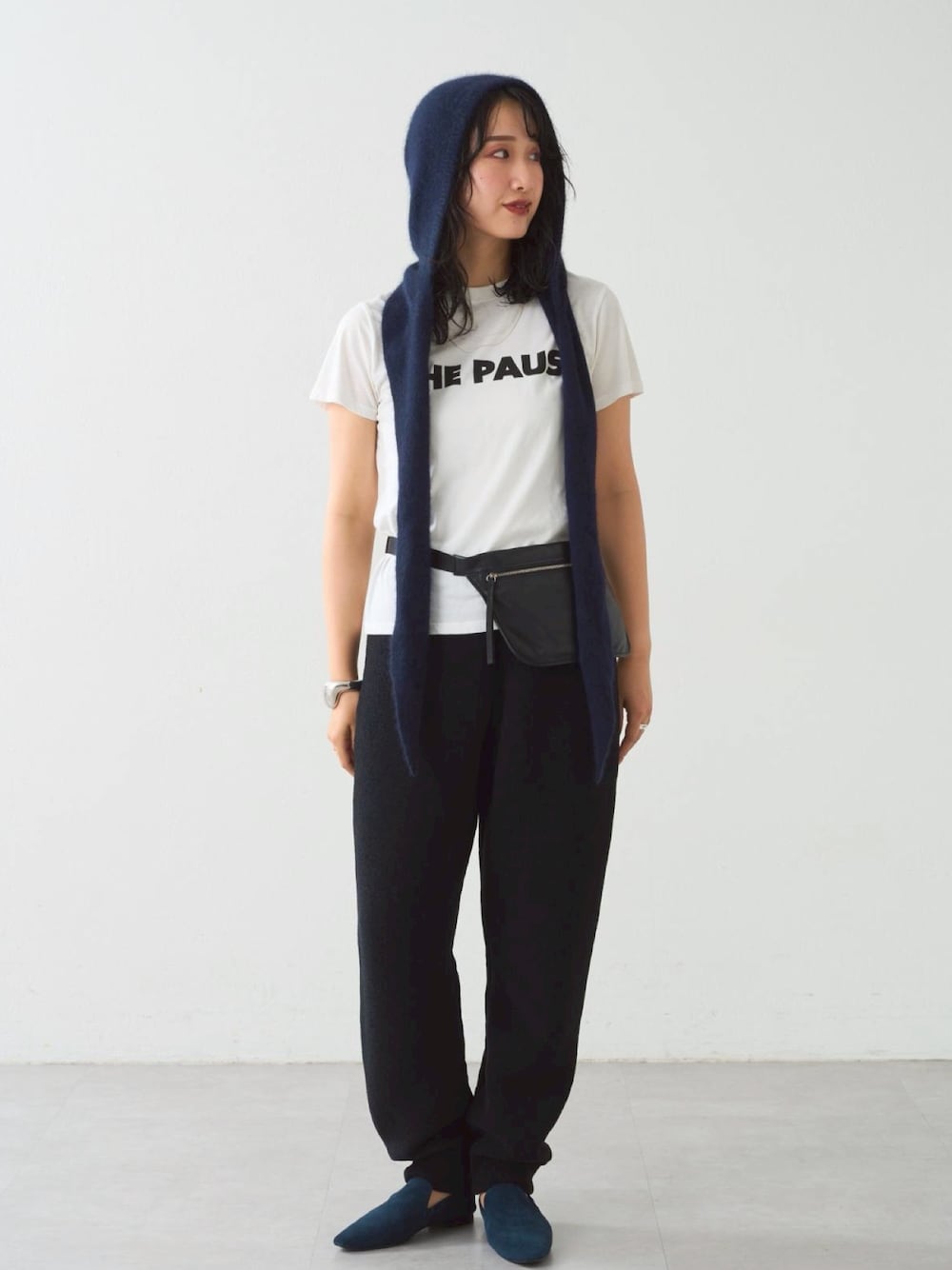 【トップス】フリーサイズ着用 ロングセラーのTHE PAUSE Tシャツ。 コンパクトなサイズ感とシンプルなロゴが使いやすいデザインです。 生地に若干のハリとツヤがあるので、カジュアル感が出過ぎず綺麗めコーデとも合わせやすいです。 夏〜秋にかけては一枚で、冬〜春はレイヤードスタイルで一年中楽しめるアイテムです。 【ボトムス】フリーサイズ着用 ふわふわとしたベロアのような質感が肌触りがよく楽ちんな着心地のジョガーパンツ。 程よくゆとりがあるので、腰回りも拾いにくいシルエットです。 裾はキュッと細くなっているので、小柄な方でも裾をためて穿いていただけると思います。