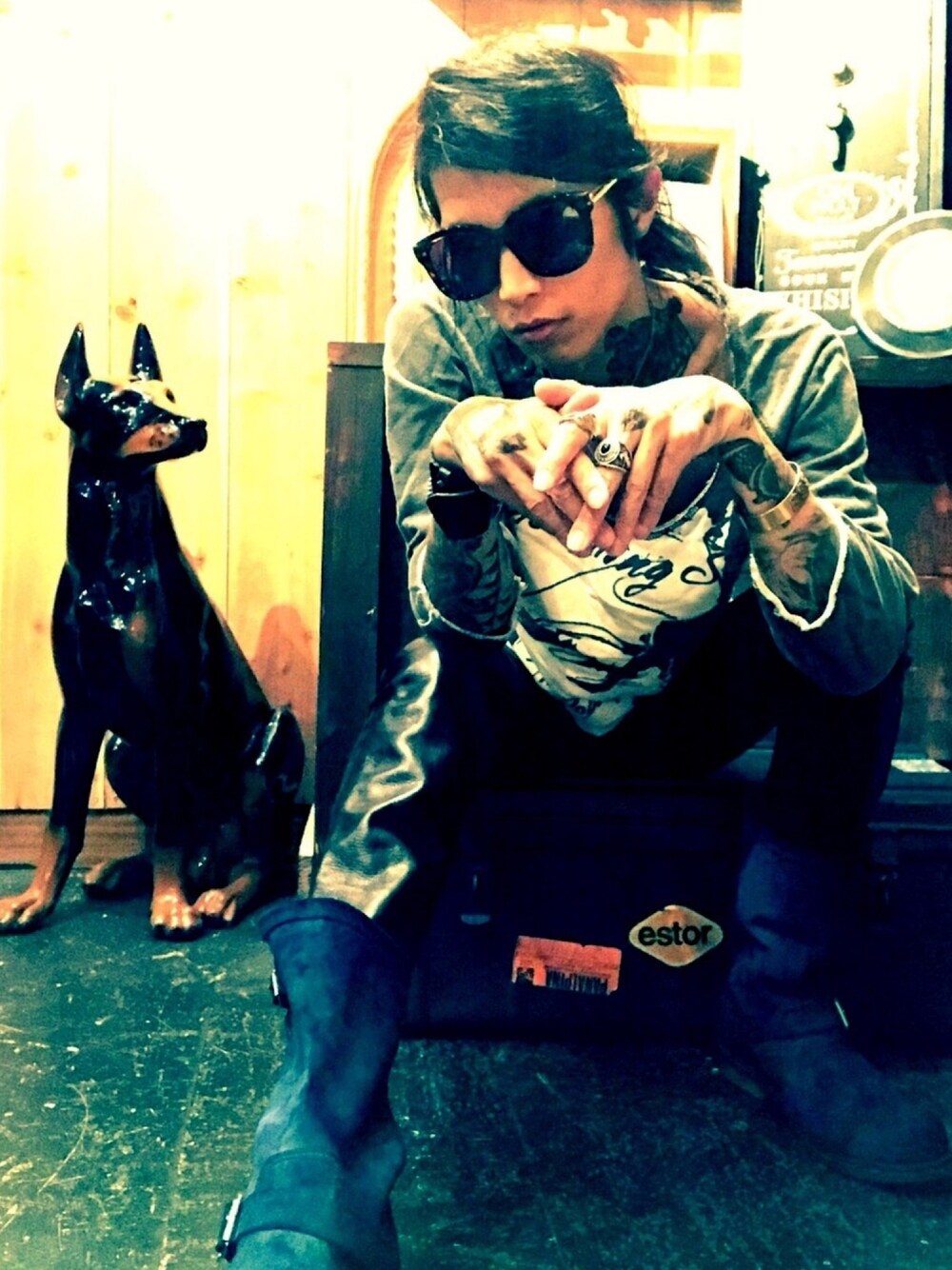 おはようございますm(_ _)m 今日はカラーcustomしたエンジニアブーツ。 スエードの色味が、胡散臭かったので どうせなら色がある胡散臭さで遊んでやろうと染色しました(^^) ストーンズのカットオフ着てはいますが バックミュージックは 7inchのアナログ STRAY CATS 【SEXY+17】とおもいきや、、、 side Bに収録されています 【LOOKIN'BETTER EVERY BEER】 を流してます。 大好きな大阪の最高の先輩であり親友が何かの節目にいつも7inchを前触れもなく送ってくれるんです。 それは、いつも俺のバックボーンでもあり いつも、その時の俺に必要な曲なんです。。。 俺はあんなカッコイイ先輩になりたいですよ。 その人のGRETSCH6120からの出音はいつも最高にセクシーで素敵です! ハコ鳴り、少しのスパイス、ピッキングのタッチ、グレッチには欠かせない弾き方の映になる角度の構え方。 文句無し! 彼を想うと、凄くナチュラルになれるんですよ。良い意味で力がぬけるというか。 今日は、ゆるくゆるく自分を保ちたいですね☆ 革パンは前身頃が革で 後ろ身頃はツイルの切り返し イヤミがないし、レザー特有な伸びきりダルンダルンの革パンにならなくてすむし重宝アイテム☆ 良きです♪ でゎ。