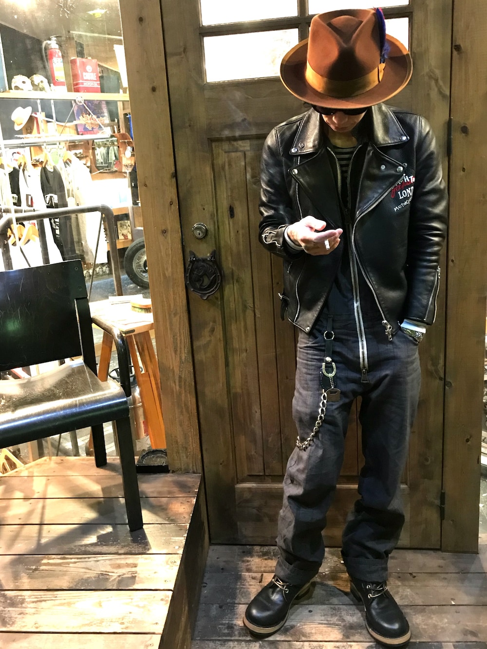 こんばんは。 本日は、新しいアイテムを☆ まず ずっとわがままオーダーしてたWHISKEY'S custom仕様として仕上がってきたRe:brothのブーツ ダイヤモンドキルトにトゥーキャップ オールダブルミッドソールにフロントトリプル、その割にソールをvibram269でスタイリッシュにしてヒールにはビルトライト 個人的カスタムの時は大体そういう仕様にしてます。 ハットはコニャック色のSTETSON 飾り羽は、小窓付けてませんがOLDMAN on velvetでちまちま製作してます ・ハット→STETSON (ウィペット、ハイクラウン) ・サングラス→FACTORY900 ・plume(飾り羽)OLDMAN on velvet ・KINGROCKERウォレット(ブライドル)→Re:broth×OLDMAN on velvet ・ツナギ→OLDMAN on velvet ・ウォレットチェーン→SPREAD PIRATES ・ライダース→SEVESKIG ・時計→HAMILTON ブーツ→Re:broth(WHISKEY'S custom リング→ANIMALIA リング→liquid and more. 寒くなってきました。 皆様、ご自愛くださいませ^ ^