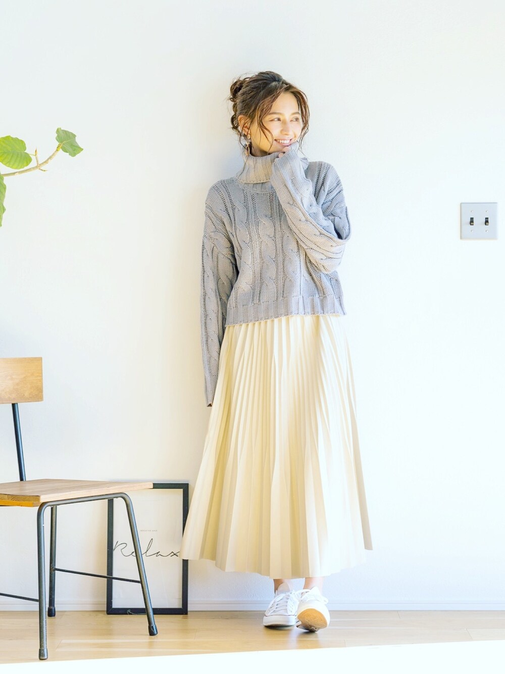 whitecollectionのニット/セーター「【ZOZO限定】ざっくりケーブル編みタートルネック・ボリュームスリーブニット」を使ったコーディネート