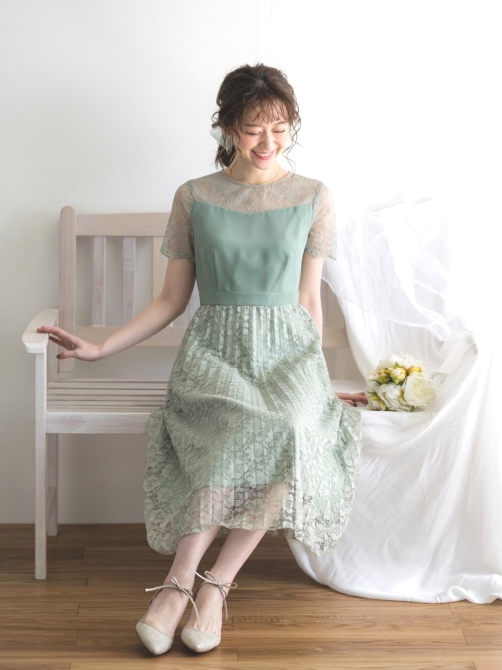 whitecollectionのドレス「レースプリーツ重ねドレス」を使ったコーディネート