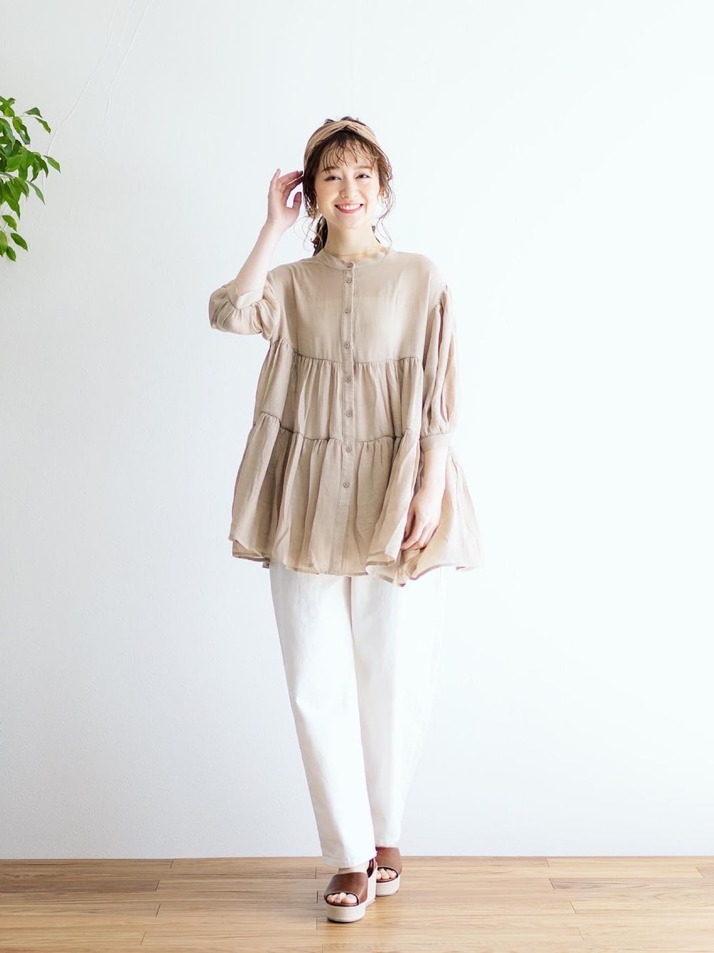 whitecollectionのシャツ/ブラウス「【2021SS新作】軽やかガーゼ・ギャザーティアード2WAYブラウスチュニック」を使ったコーディネート