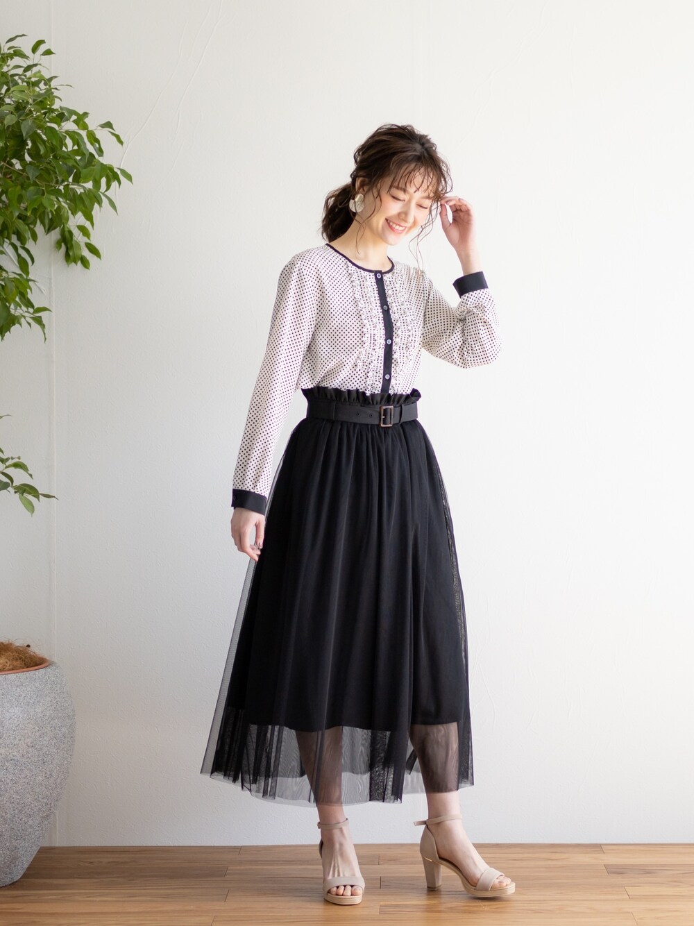 ドットブラウスとチュールスカートの甘めモノトーンコーデ