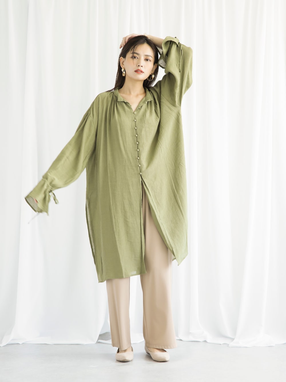 ボリュームスリーブとロング丈がポイントの秋色シャツ。ゆるパンを合わせてナチュラル♪
