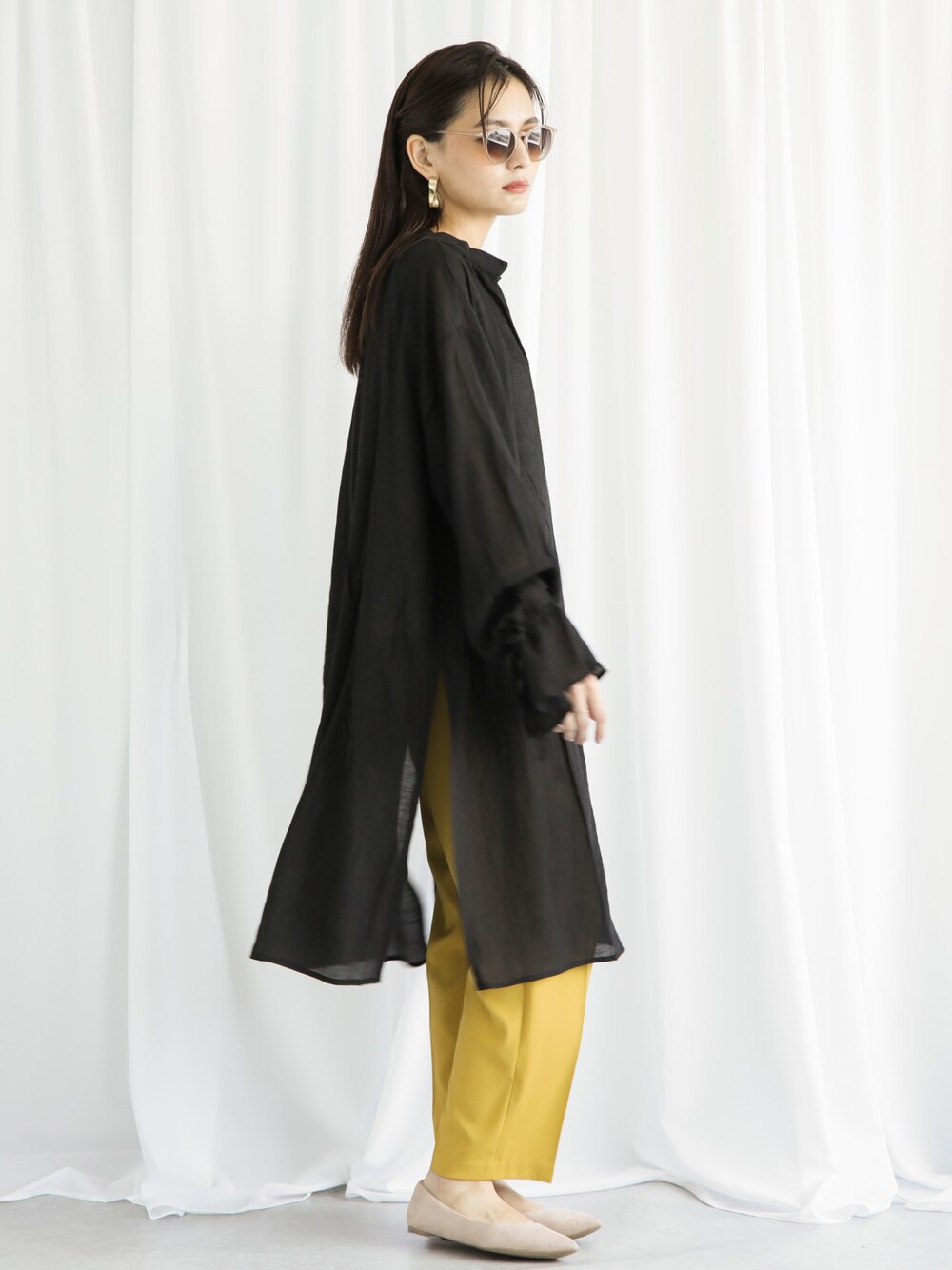 ボリュームスリーブとロング丈がポイントの秋色シャツ。ゆるパンを合わせてナチュラル♪
