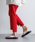 シルエットと履き心地が好評のAnsideの定番型テーパードパンツ。 カラーパンツの展開になっており、いつものコーディネートを明るくしてくれます。 裾のスクエアカットはフラットシューズに合わせても甲に押されて裾がたまらない作りになっていて、スタイルアップ効果が期待できます。 リネンライクなポリエステル素材。ストレッチがあり、快適な履き心地です。 ※後ゴム仕様です。
