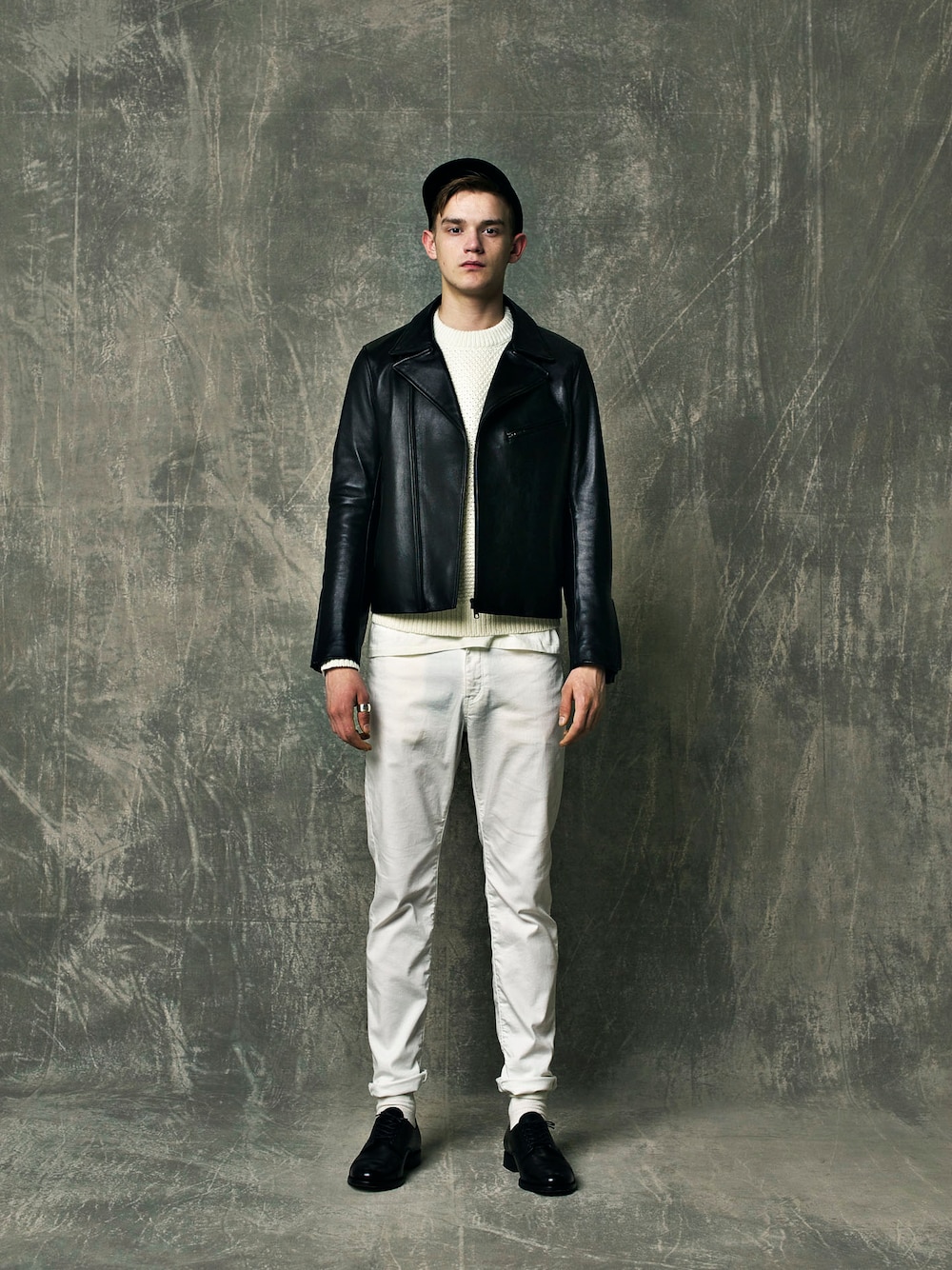 OUTER : W-RIDERS JACKET ( VICTIM ) KNIT : WAFFLE KNIT ( VICTIM ) BOTTOMS : STRETCH SLIM PANTS ( VICTIM ) SHOES : VICTIM × SANDERS / MILITARY DERBY SHOES ( VICTIM )