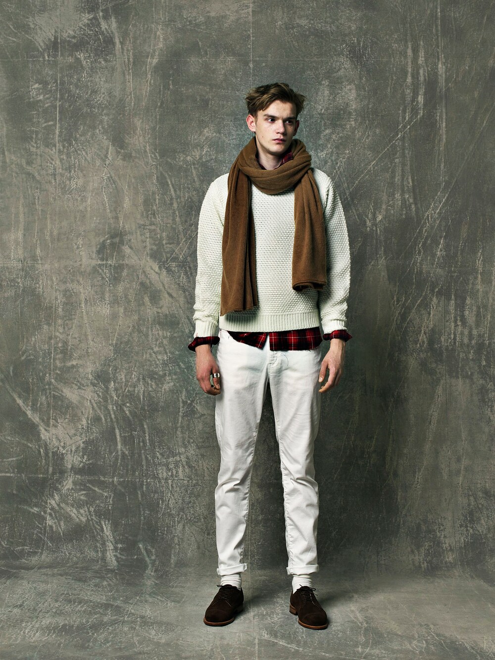 KNIT : WAFFLE KNIT ( VICTIM ) SHIRTS : DAMAGE CHECK SHIRTS ( VICTIM ) BOTTOMS : STRETCH SLIM PANTS ( VICTIM ) STOLE : BIG STOLE ( VICTIM ) SHOES : VICTIM × SANDERS / MILITARY DERBY SHOES ( VICTIM )