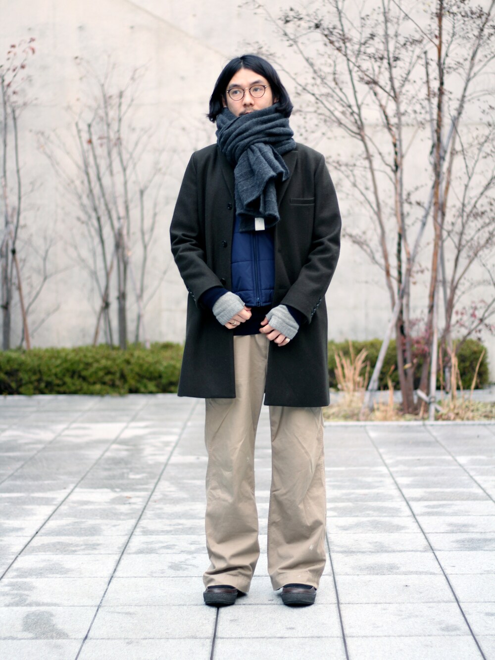 最近の通勤&仕事着です。 ワイドパンツな気分なので、スタンダードのチノパンを履いてきました。 どうしてもコートが黒や紺なので、太めなベージュのパンツは使いやすいです。 白のニットとベージュのパンツってのも今年っぽくていいですね。 寒いのは嫌いなのでタートル、インナーベスト、ムートンブーツ、 マフラー、グローブの組み合わせで完璧です。 COAT : CHESTER FIELD COAT VEST : NO COLLAR VEST KNIT : TURTLE NECK KNIT BOTTOM : STANDARD CHINO PANTS / CLASSIC TYPE BOOTS : MOUTON BOOTS GLOVE : VICTIM × Johnstons / CASHMERE GLOVE 最近、スマホ対応のグローブも出てますが、僕はやっぱり 指ぬきタイプの方が携帯を扱いやすいです。