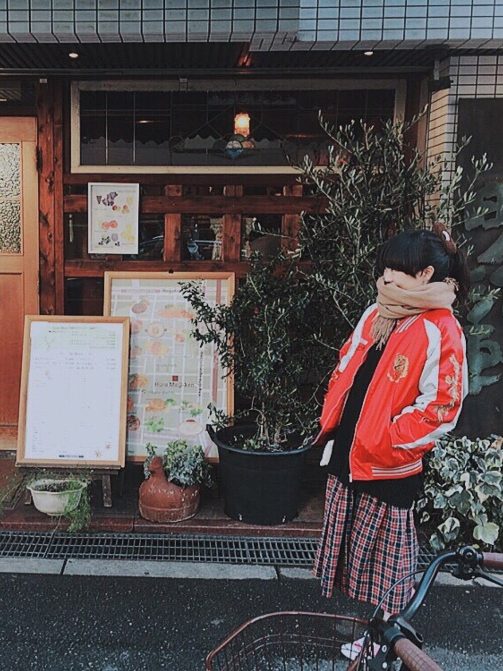 堀江にある洋食屋さん明治軒の前。スカジャン。