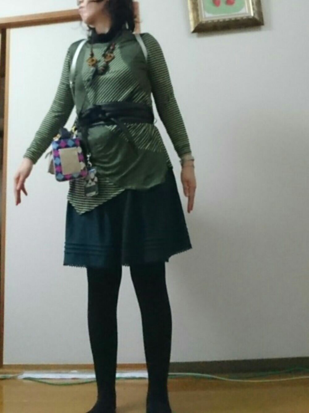 チュニックにサッシュベルトを使ってウエストマークがこなれ感、着痩せ効果狙っています。