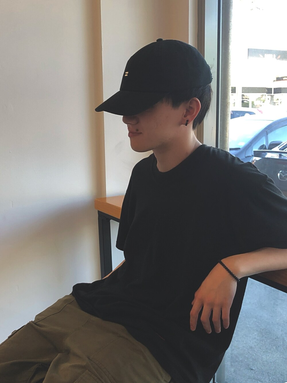 ブラック系のTシャツ/カットソー、グリーン系のチノパンツを着用したメンズの春コーディネートの1枚目の写真