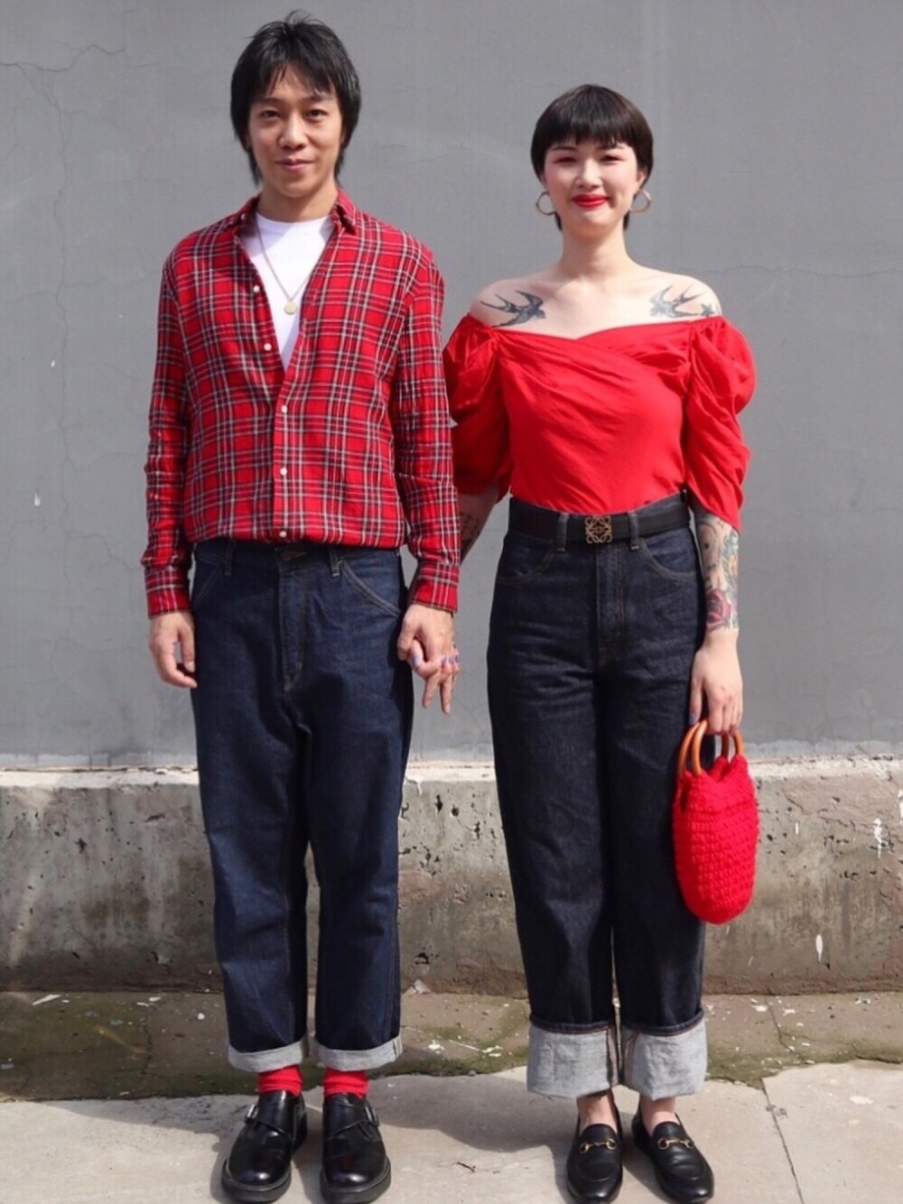 九号情侣 _ Look 27 红色为此次搭配的重点颜色 用深蓝色牛仔裤搭配休闲皮鞋凸显时尚风格 整体风格休闲且时尚