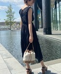 【涼やかなサマーブラック】 繊細な光沢感が美しい1枚サマのワンピース。 帆布バッグと、軽いウッド調ヒールのサンダルで、涼やかに。