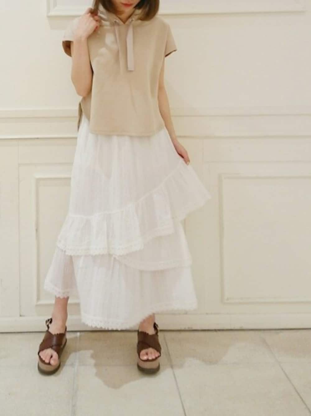 涼し気なサマーカジュアルコーデ♡ パーカーはラウンドヘムとフレンチスリーブでフェミニンに決まるのが嬉しい♪ コットンスカートとブラウンサンダルでナチュラルなイメージに♡