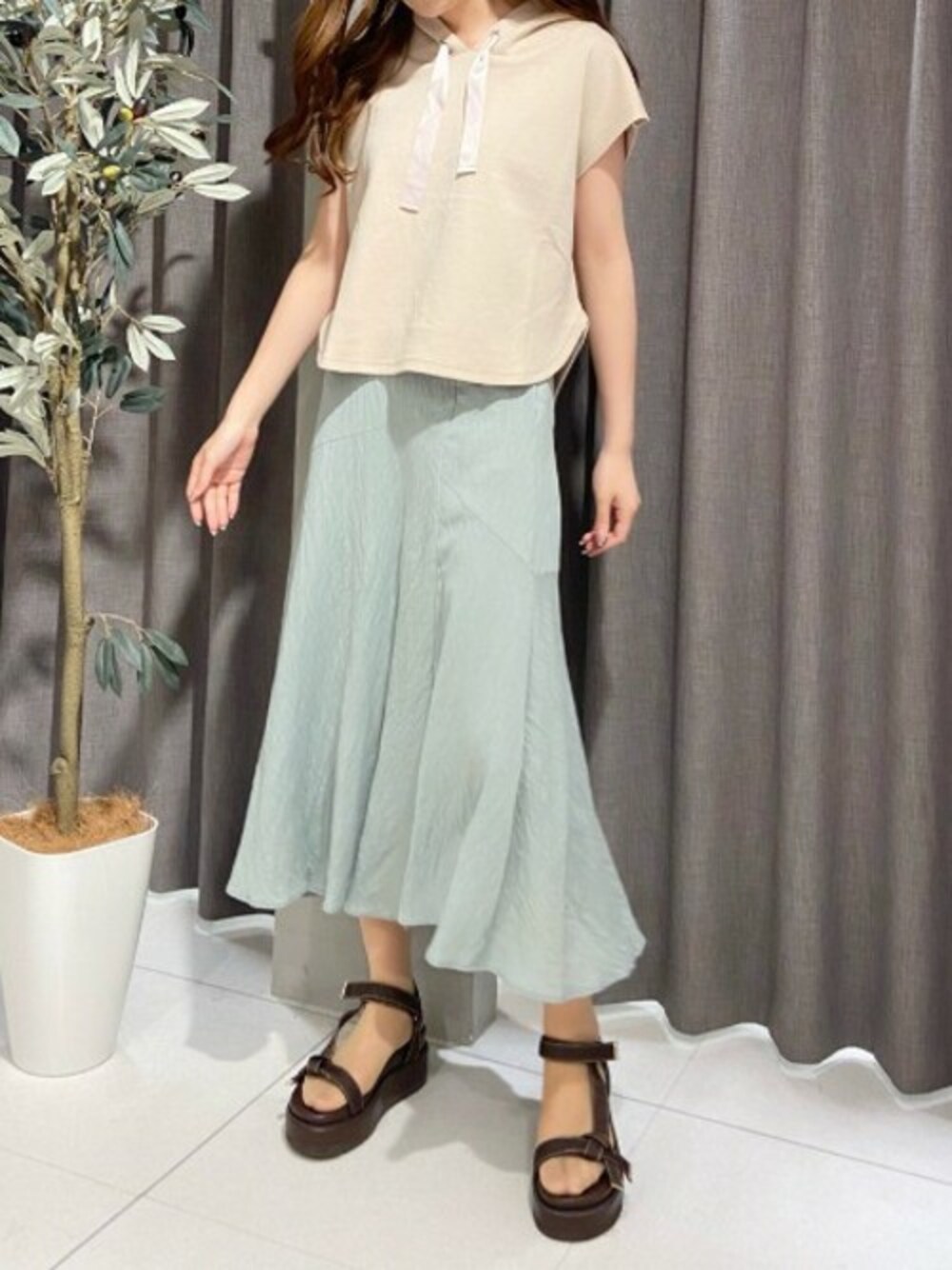 上からベージュ、グリーン、ブラウンのアースカラーで、 夏らしい爽やかナチュラルなコーディネートに♪ パーカーはすっきり&女性らしく見えるデザインなので、 この夏のフェミニンカジュアルに大活躍しそう♡ トップス、スカート→Mサイズ シューズ→Mサイズ(23.5cm)