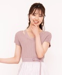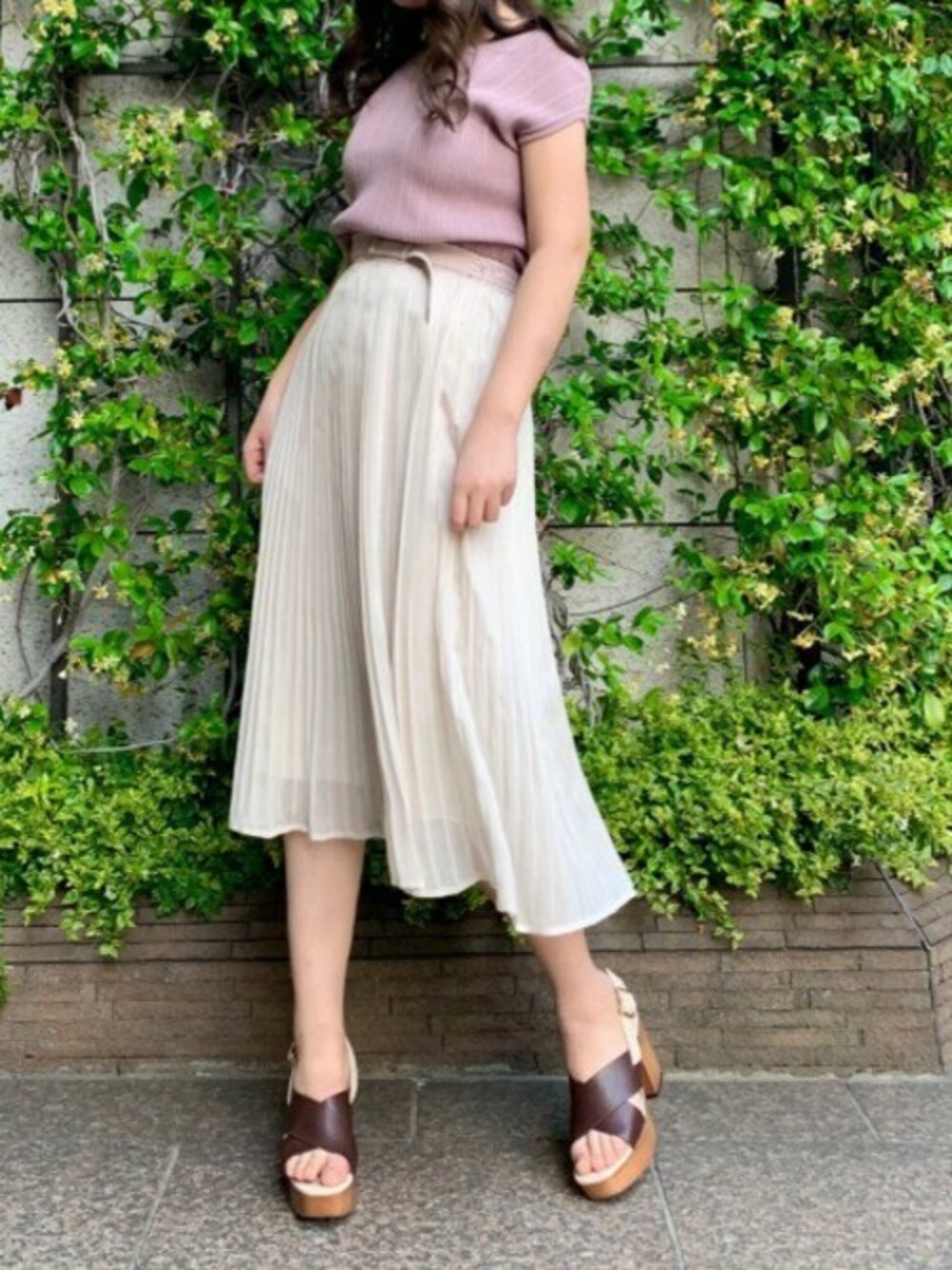 感度の高いフェミニンスタイル♪ ラベンダーとエクリュの優しいニュアンスカラーコーデ♡ 揺れるスカートはシャイニー感のあるシアー素材。 ベルト付きで、ニットINスタイルもきれい♪