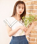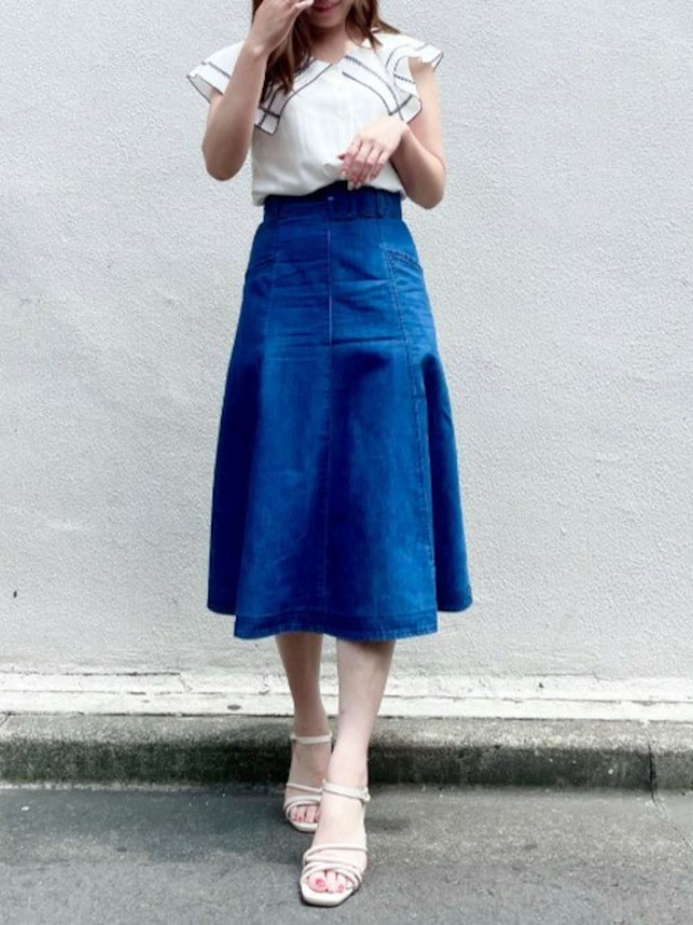 スタイルがきれいに見えるガーリーコーデ♪ 夏の美フレアデニムにキュン♪ 刺繍のバイカラーがポイントの襟デザインが今年らしいブラウスで、さりげなく二の腕カバー&旬顔に。